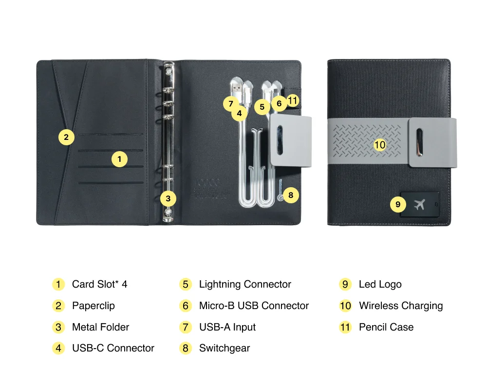 Practical for Office, Meetings, and Travel Combining a sleek exterior with versatile charging and storage features, this notebook is ideal for daily use or business gifting.