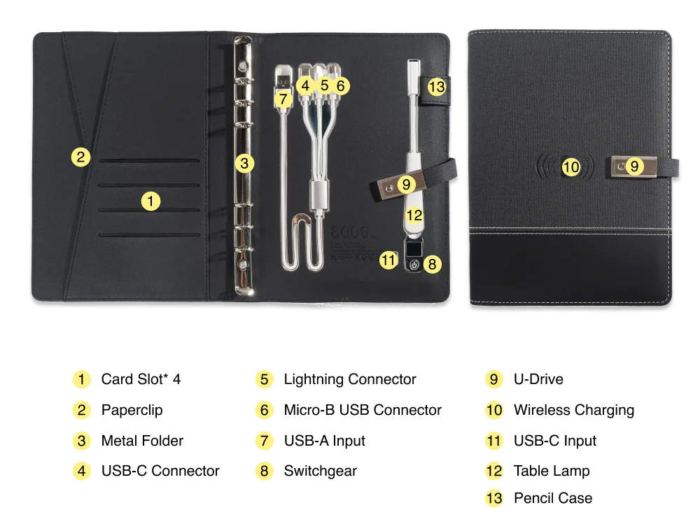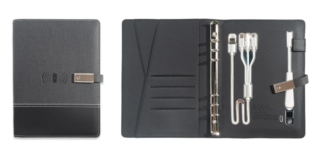 A5 Notebook with built-in Power Bank, wireless Charging, 3-in-1 charging cable, Table light, USB drive. Journal for Office.
