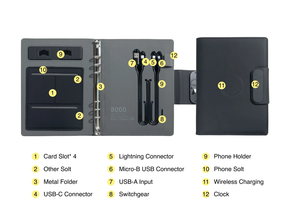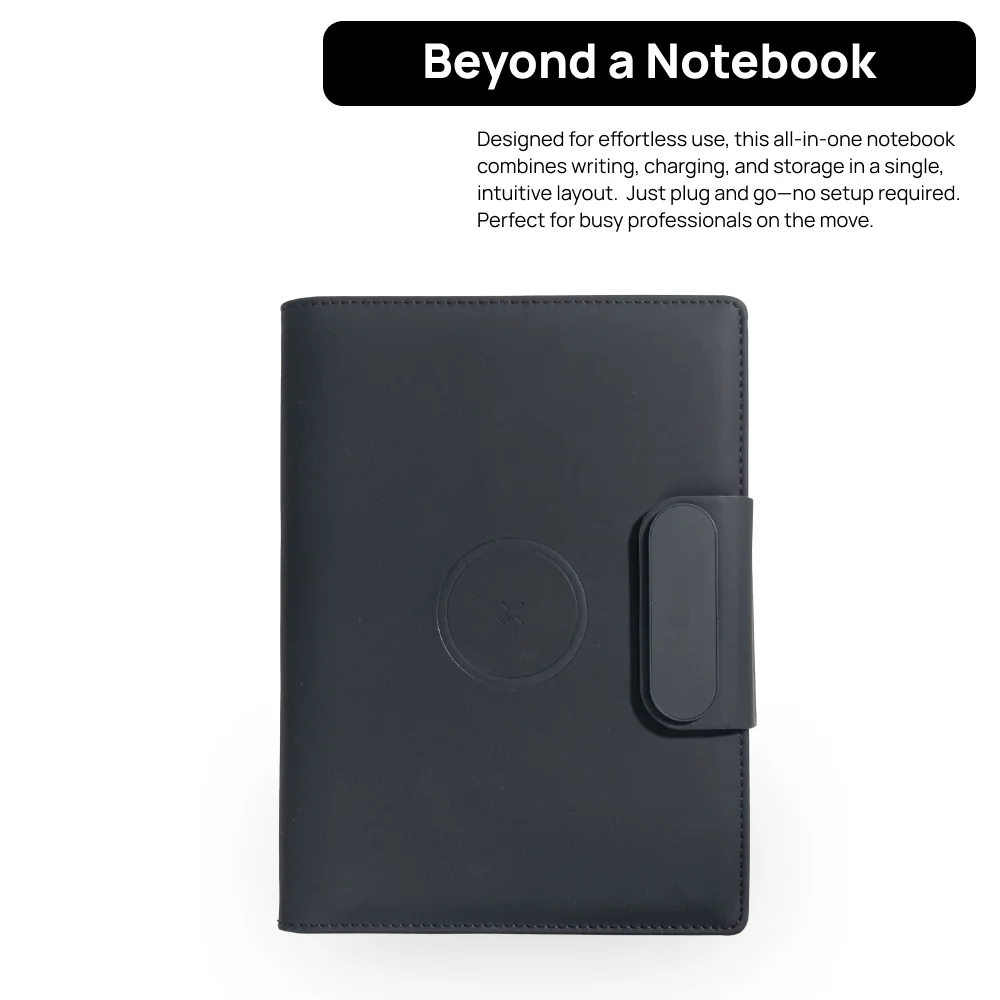A5 Wireless Charging Notebook with PU Leather Cover, 3-in-1 Cable, Document Pocket and Foldable Phone Stand